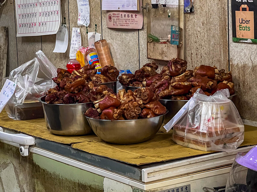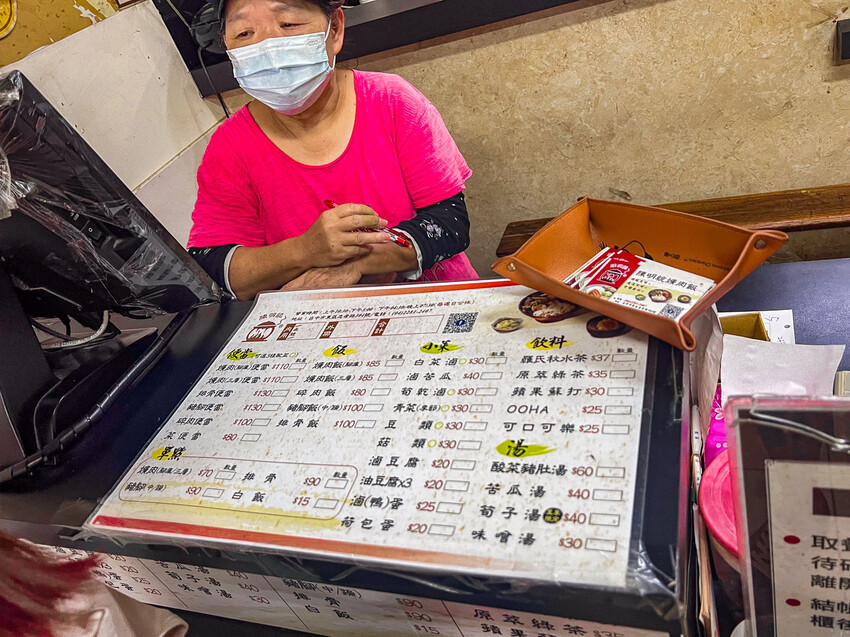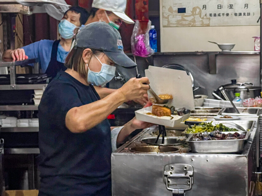 後方則是料理區,店員都超忙碌的,生意超級好,後面有一個個大陶甕,這就是陳明統的美味秘密之一,爌肉、腿庫都是用陶甕滷製燉煮,點了才會從陶甕裡夾出來,旁邊的桌上還擺了好幾桶待滷的腿庫