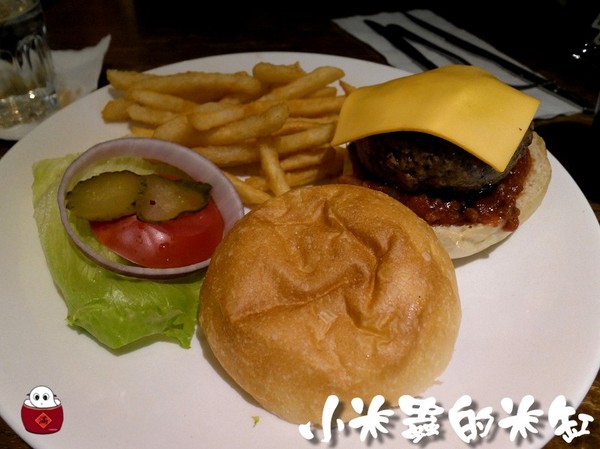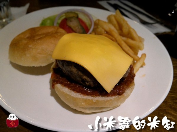 烤的酥脆的漢堡上,擺上了肉醬、漢堡肉跟起司