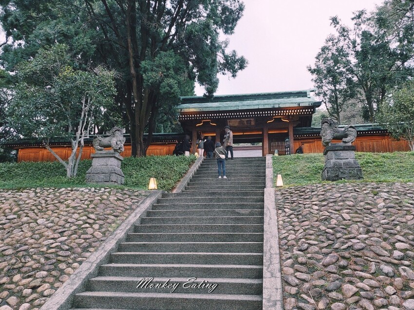 一路沿著石梯向上,來到忠烈祠中門,這裡是前往拜殿的必經之路,進入莊嚴肅穆的祭祀空間,裡頭是個截然不同的綠意風景。