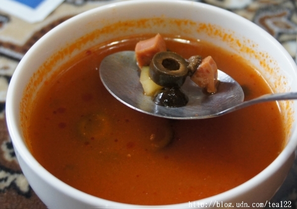 橄欖湯:橄欖、酸黃瓜、熱狗丁,用蕃茄熬煮,喝到的是蔬菜的鮮美,千萬別被碗邊緣的紅色所騙,那不是辣椒,也不是紅油,而是純天然的茄紅素。