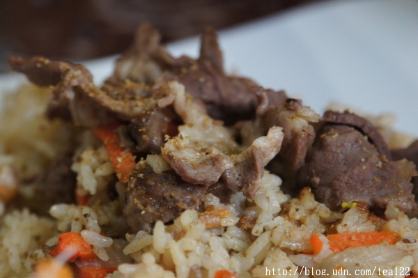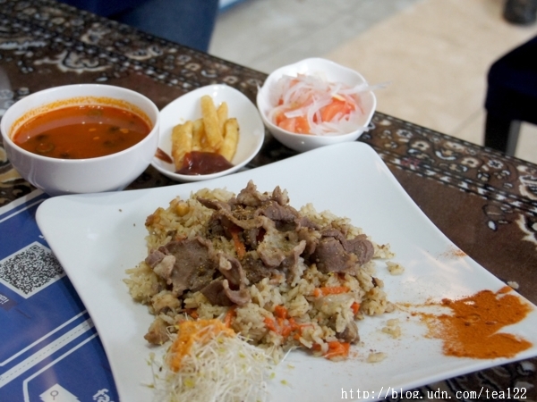 據老闆所言,在烏別克節慶時,家家戶戶都會做這道燉羊飯,這看似不特別的飯,可是整個燉二個小時才能出爐的,胡蘿蔔、洋蔥、羊肉先拌炒熟,再加入生米燜煮,和西班牙燉飯有著異曲同工之妙。