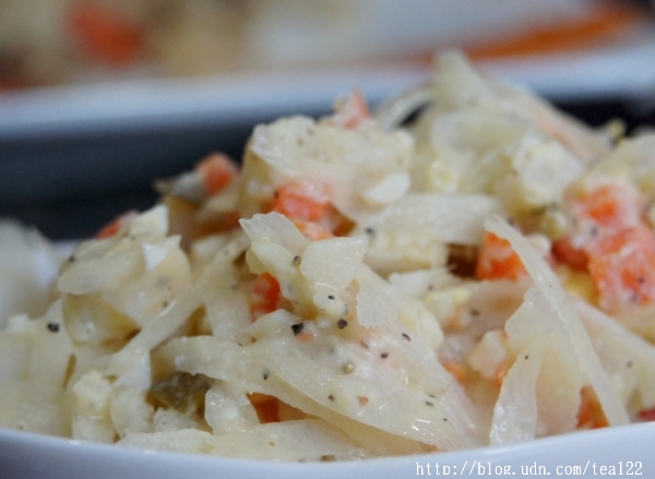俄羅斯沙拉:洋蔥、胡蘿蔔、馬鈴薯、酸黃瓜…,多樣蔬菜所調成,讓人吃了一口,就欲罷不能了。