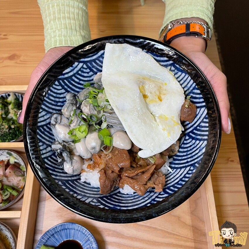 這個又要做成暴動了! 蚵仔鮭魚卵滷肉飯(279元),超大顆的蚵仔搭著鮭魚卵及蝦卵三代同堂,小米吃完真的要痛風了