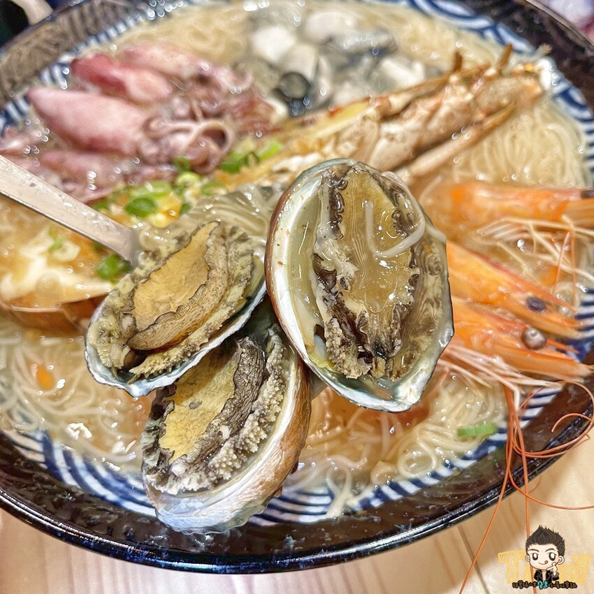 特盛龍蝦痛風麵線 598元,老闆用料一點也不手軟,上頭有大隻的龍蝦、九孔鮑魚、小卷等數種海鮮,絕對是東門市場最浮誇的麵線了