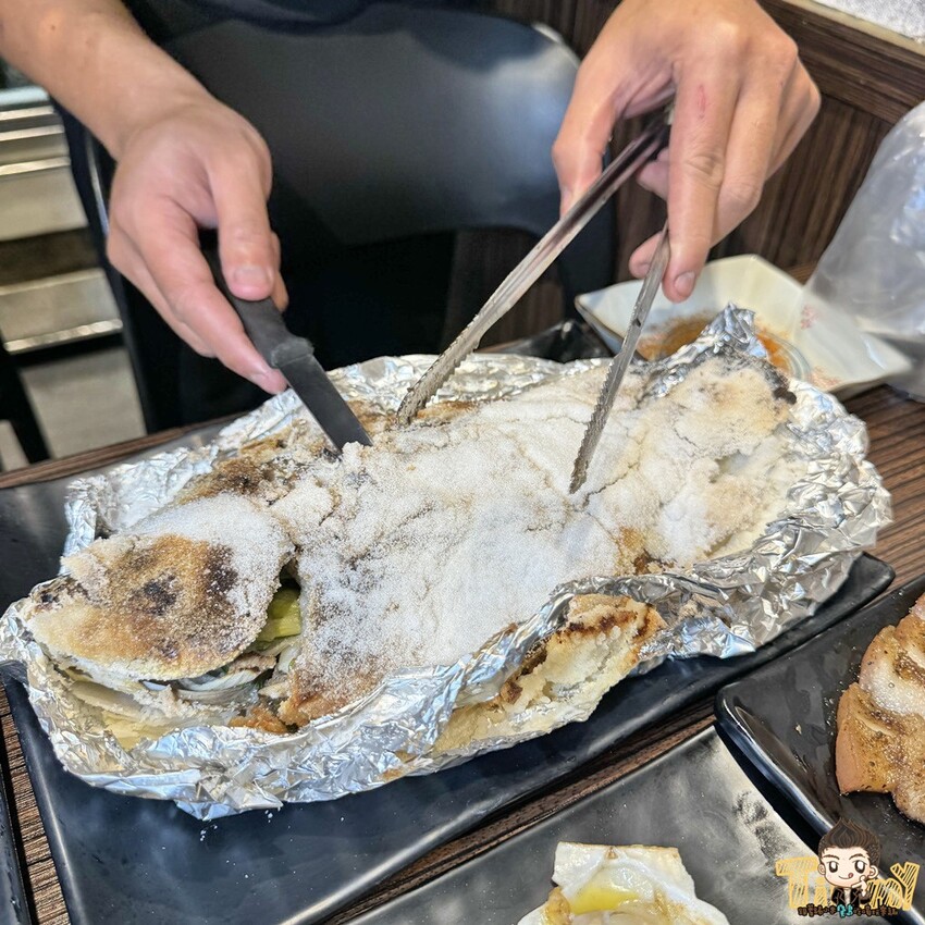 多人來用餐的話,可以點鹽烤魚(390元),師傅不只處理得很乾淨,魚肚塞入獨門香料後,利用鹽焗方式來烤魚,可以鎖住魚肉的湯汁