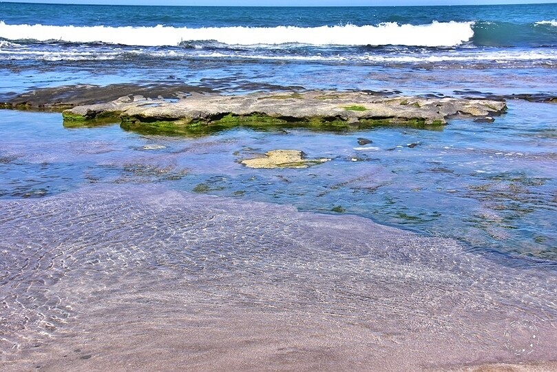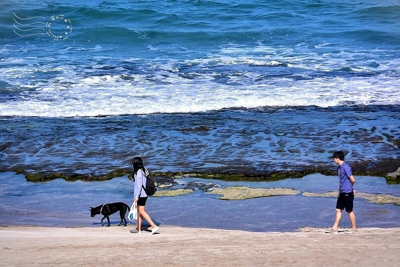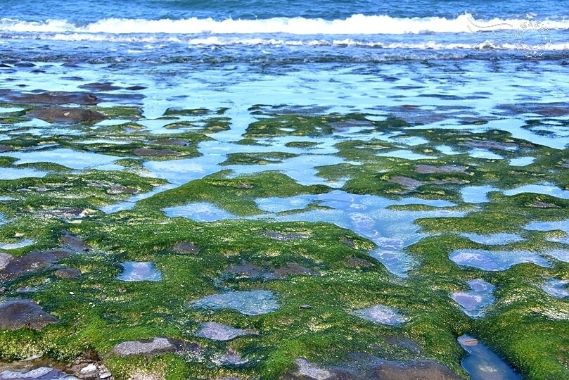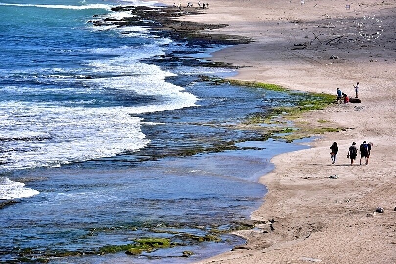 ↓但仔細觀察,明明是沙灘,卻同時擁有侵蝕岩岸,岩石上明顯附著些海藻綠。