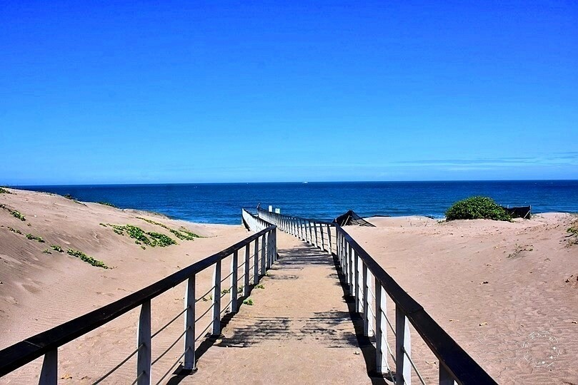 ↓黑扶手白竿的木棧道盡頭是純淨的碧海藍天,竟然滿滿的異國風情。