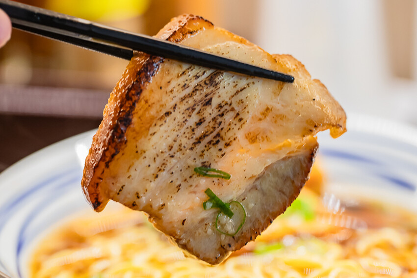 拉麵店常見的肉片有里肌叉燒肉,這裡用的是五花叉燒肉,炙燒過的五花叉燒肉很香,炙燒過也會降低油膩感,脆筍的酸度滿高,是天然發酵的酸味,酸甜酸甜的像蜜餞,令人印象深刻。