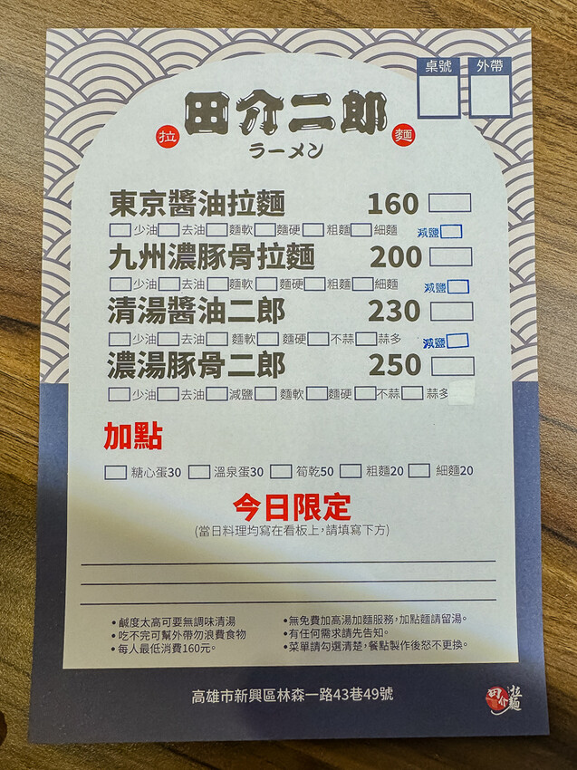 □少油 □去油 □麵軟 □麵硬 □粗麵 □細麵 □減鹽