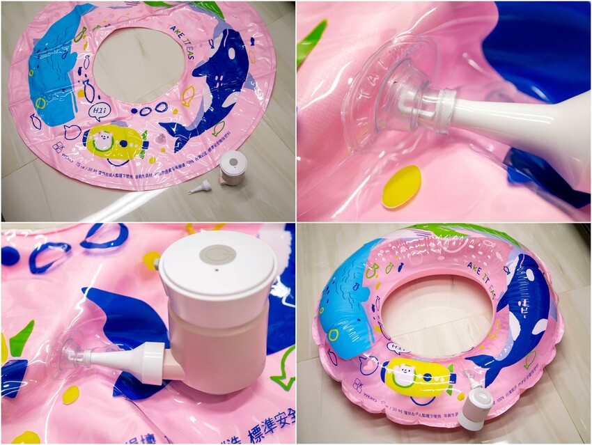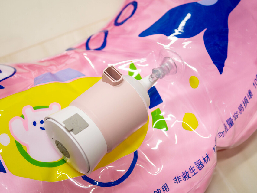 另外像是一開始有提到,轉接頭接在主機不同位置就可以切換充氣/抽氣的效果,雖然夏天還沒到,但先拿出泳圈來嘗試看看,主機小小一個,充氣速度比想像中的快很多!