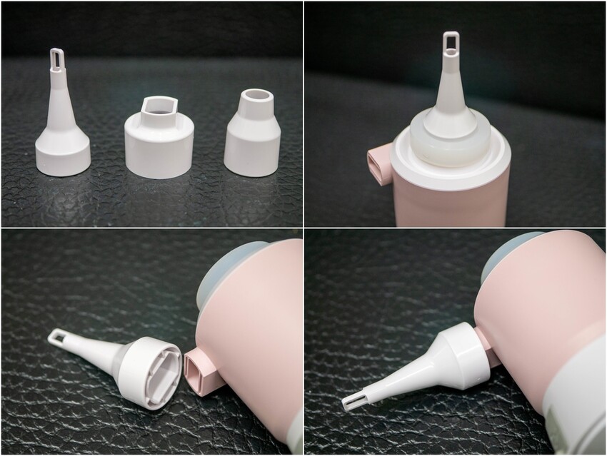 附上三種接頭,可以滿足市面上大多的充氣設備,接上側邊就可以充氣、接上底部就可以抽氣