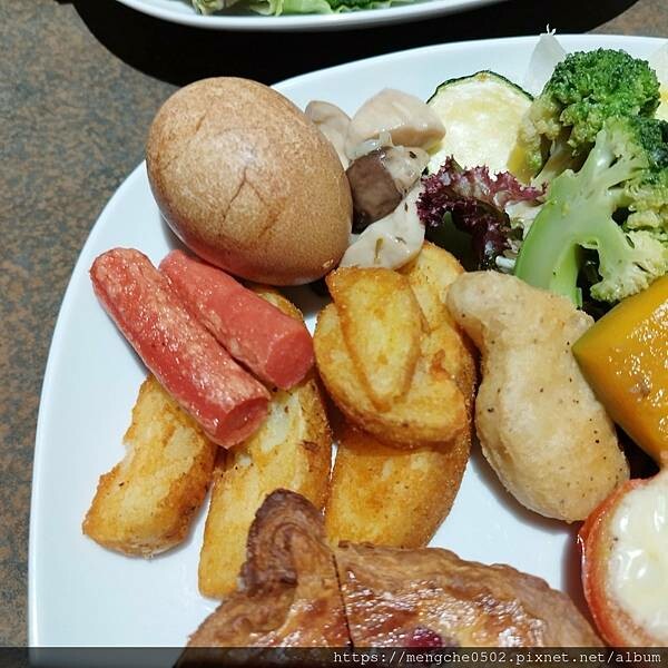 沙拉淋上油醋醬非常清爽,起司番茄算有特色,水果裡面有紅心芭樂和楊桃,比較普通的是熱狗和雞塊,一盤吃下來水煮蛋沒吃完,飽到下午都不餓。