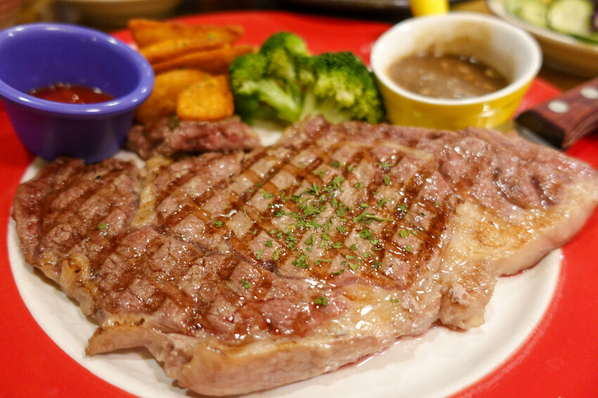 五分熟的牛排,肉質粉嫩,原味已經很美味,搭配店家提供的黑胡椒醬更是美味加分。配菜的紅蘿、花椰菜和炸薯片豐富而均衡。