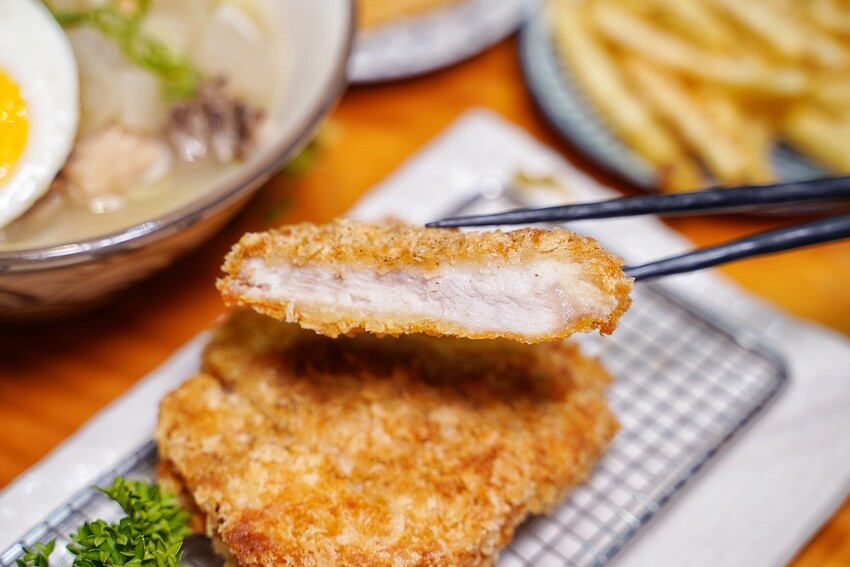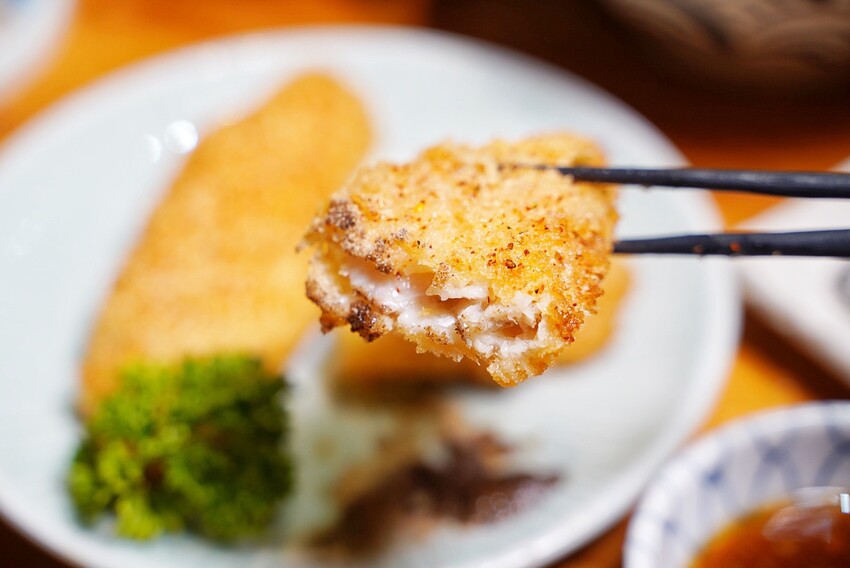 「炸豬排」外皮炸至酥脆乾爽,厚實多汁的豬排,還附上蘿蔔泥柴魚醬汁可以沾著享用。