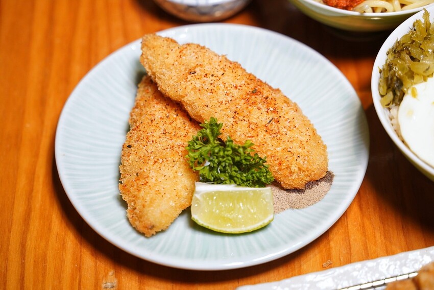 「白身魚」一份有兩塊,外皮相當酥脆,魚肉細緻又鮮嫩且完全沒腥味,沾點胡椒鹽、擠上檸檬汁就非常好吃。