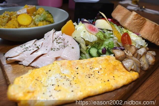 非常有活力的豐盛早午餐,內容物相當豐富,有:香煎歐姆蛋、新鮮時蔬水果沙拉、舒肥雞胸肉、手炒杏鮑菇以及原味貓生吐司,飽足感十足、營養滿分。
