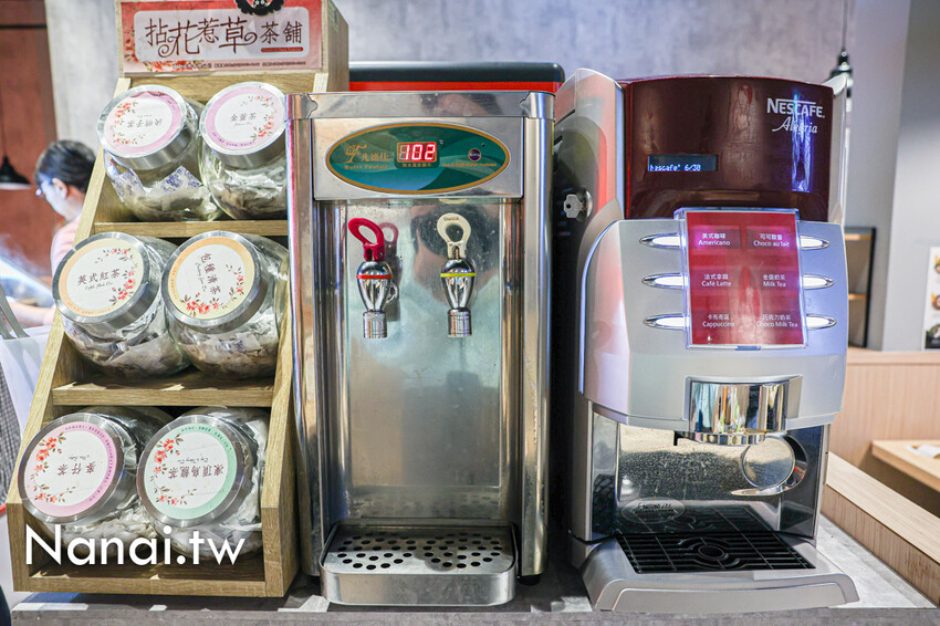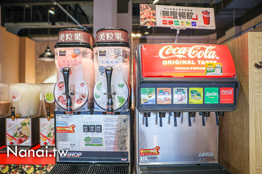 飲料品項選擇不少,有可口可樂機、美粒果冰沙、冬瓜檸檬、奶茶、荔枝多多、綠茶、咖啡機、花茶茶包..等免費無限暢飲,小孩才做選擇,就是要通通喝一輪,若沒有喝冰飲也別擔心,現場有熱茶包或熱咖啡機可享用。