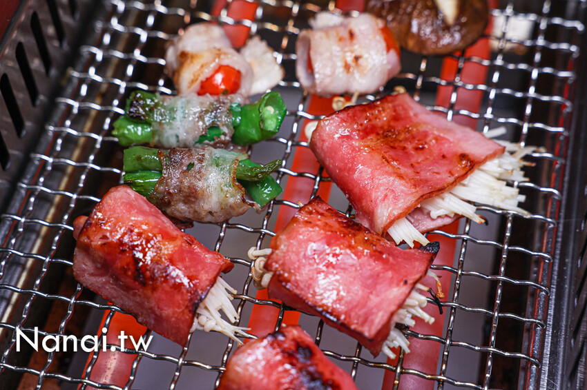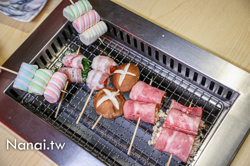 肉串有牛五花捲青龍椒、番茄豬肉串、培根肉捲金針菇,刷上醬汁放置烤爐烤,吃起來就像串燒店口感,蔬菜夾著肉片不油膩又爽口。再來是烤香菇和青龍椒尬杏鮑菇,烤後的口感鮮美又多汁。最後可頌麵包和棉花糖,麵包不用烤太久,烤的微微酥香味道更棒,熱棉花糖入口融在嘴裡的綿密感好滿足。