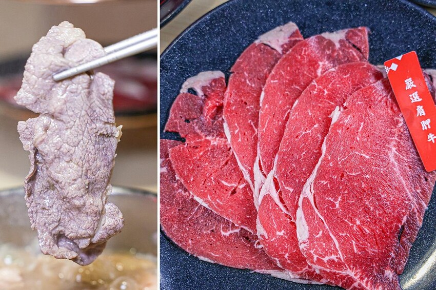 嚴選肩胛牛它的脂肪與瘦肉分布平均,油花比起前兩道少許多,涮至七分熟後放入口中,牛肉香氣在嘴裡迸開,結實的肉感又帶彈嫩度,整個口感挺不錯的。