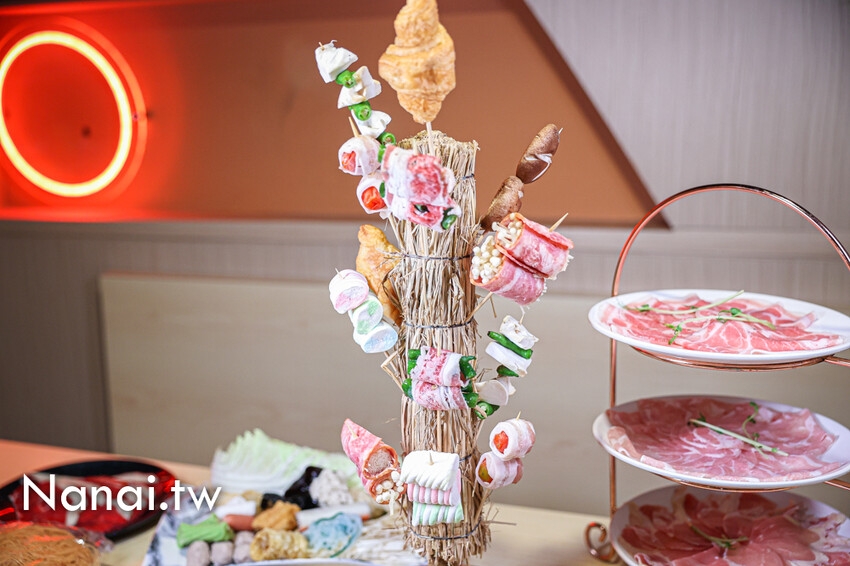 築崎相撲鍋物加碼推出糖葫蘆木樁烤串,一上桌大家爭鋒拍照,吸睛指數百分百,真的有夠浮誇,而且價格超親民,原價388元,限時特價只要189元,推薦大家有來用餐一定要點。這道糖葫蘆木樁烤串有經典肉串、綜合蔬食串、甜食串,加起來多達13串,和友人一邊吃火鍋,一邊體驗DIY烤肉樂趣很醋咪。