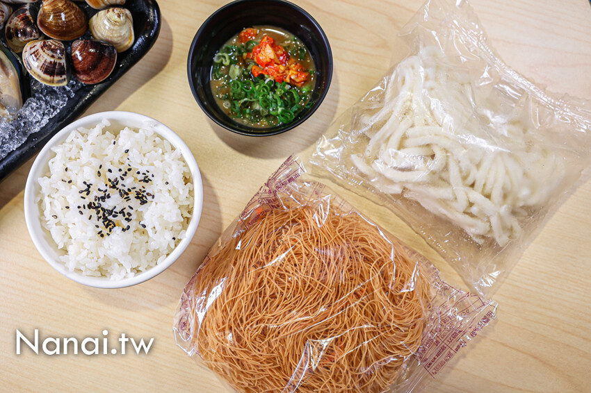 築崎相撲鍋物的副食有六種可選,我們選了白飯、烏龍麵、雞絲麵三種,除了白飯不用加購,其餘要加購10元~15元。