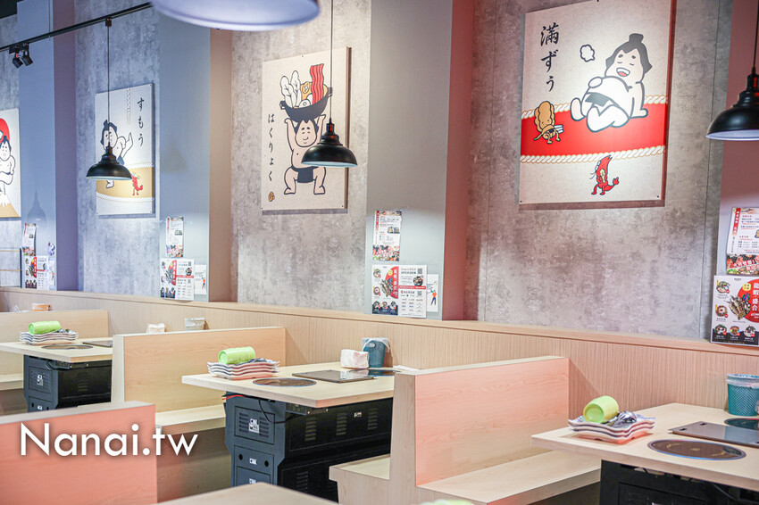 帶大家來參觀店內環境,雙腳踏進用餐區,瞬間被牆面上的相撲掛畫吸引,一整排的相撲選手Q版畫作,可愛到不要不要,我的心情也跟著愉悅起來,不僅如此使用大量清水模灰與原木色桌椅設計,以及霓虹感的LOGO牆面,整間氣氛文青又舒適。
