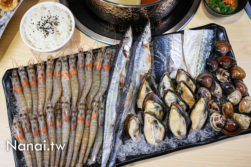 浮誇到不行~我們每人只加價100元,就能升等五種海鮮澎湃豪華盛合,裡面享有白蝦,蛤蜊,淡菜,秋刀魚,鯖魚無限續加吃到飽,若個人加購則需加價159元。話說當店員將海鮮盤端上桌時瞬間被嚇到,份量給的超霸氣,不僅如此除了這盤外,你若吃得下都可以在免費續加,保證值回票價,近期想補補身體或是備孕男士,來築崎相撲鍋物用餐絕對賺到,只不過此活動只限定於愛買復興店。