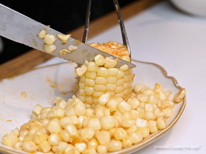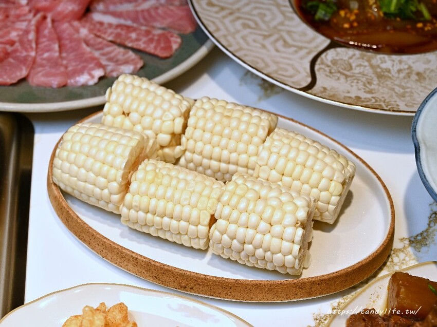 重慶火鍋緋花的玉米是採用香甜的水果玉米,特別的是只要點水果玉米的朋友們,煮好後服務人員會在桌邊為大家切玉米,變成好入口的玉米粒,可以優雅地品嘗玉米,不用豪邁啃食,水果玉米吃起來非常清甜又多汁