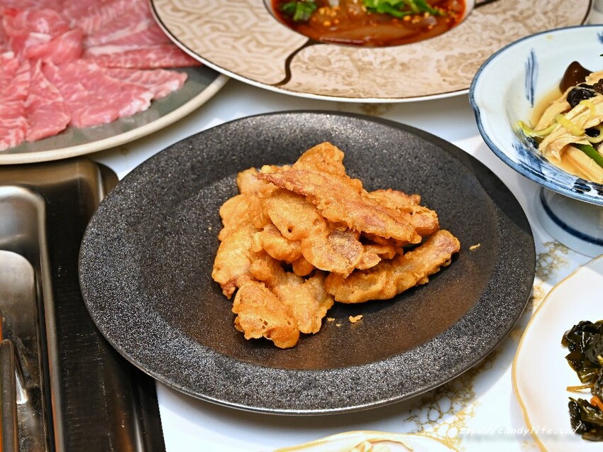 來到重慶火鍋緋花必點的特色餐點之一,採用豬肉先醃製過,再裹粉下去炸至金黃色澤,外皮香酥脆口,裡頭豬肉紮實帶點咬勁,尾韻帶有小辣及麻香味,單吃超涮嘴,還可以沾著重慶牛油鍋享用別有一番風味