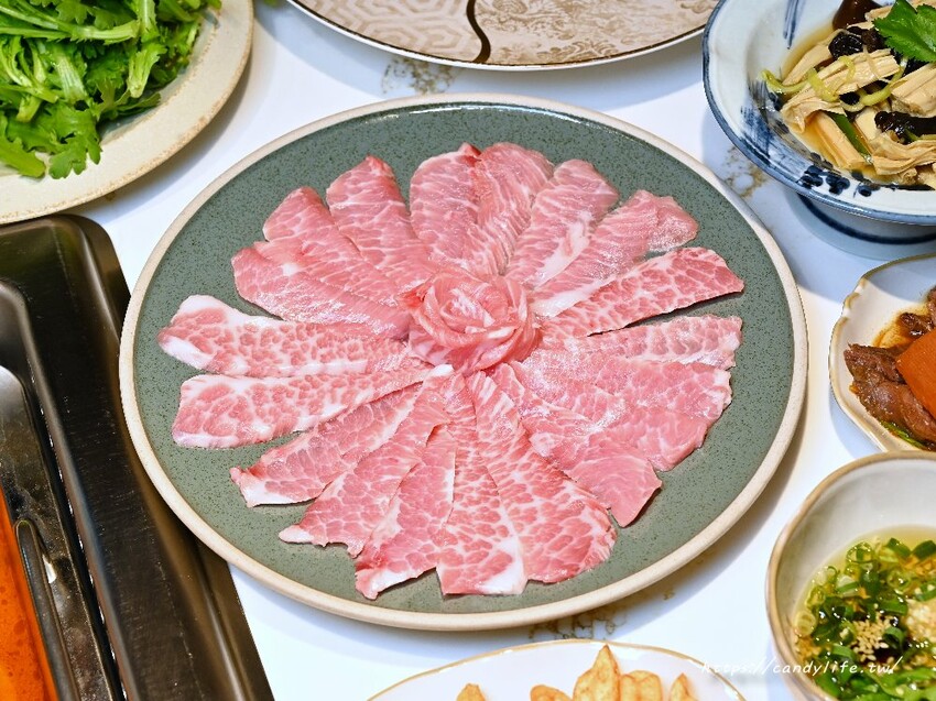 嚴選美國Prime等級的牛五花,取自胸腹部,有著豐富油脂,入鍋涮煮至七分熟,肉質軟嫩多汁,富有濃郁的牛肉香氣