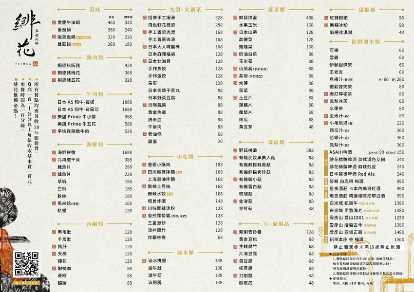 重慶火鍋緋花是採用平板電腦點餐,平板上頭都有清楚標示品名及價格,用餐時間為100分鐘,身高一百一十公分以上每人酌收基本費100元,所有餐點需另收10%服務費