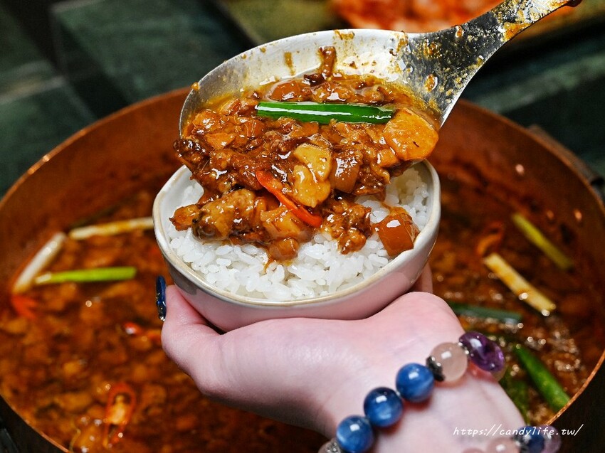 重慶火鍋緋花內用不僅讓你白飯爽爽吃,除了剛剛的蘿蔔燉牛肉,還有一大鍋超銷魂的滷肉,肥瘦勻稱,淋在白飯上頭,鹹香中帶點微甜,扒上個幾碗都沒問題