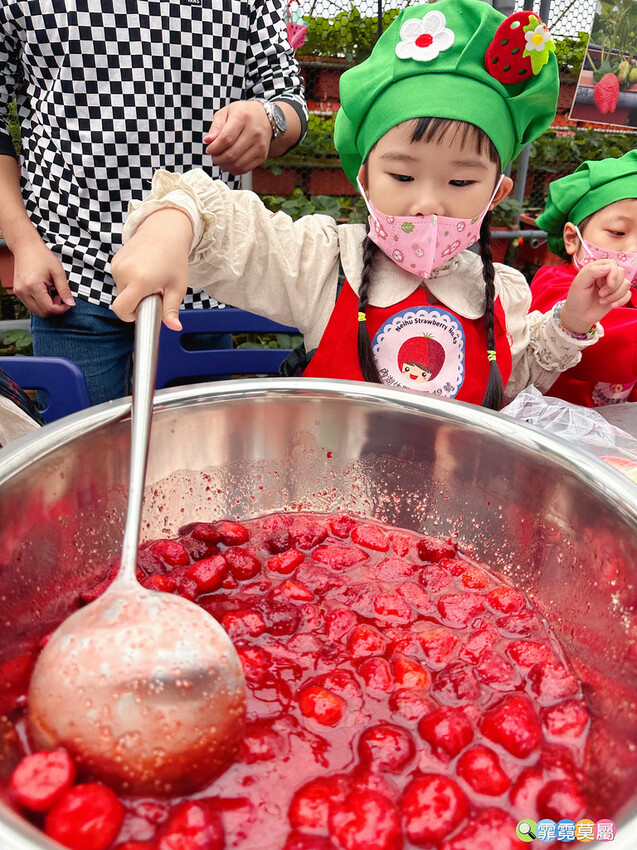 再把果醬放到前面去由大人們輪流上場煮,我們家爸爸再次裝扮成草莓人煮果醬,農場會請大家一起加油打氣,每次這環節大家都笑翻也覺得超好玩😆