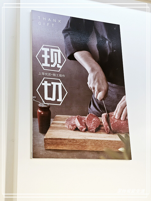 牆上貼著海報,說明肉品都是現切,非組合肉。