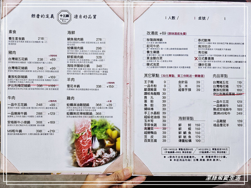 原則上先選肉品再選湯底,最便宜的素食鍋是218元,最高單價是398元,也可更換成不同湯底,一律加69元,口味選擇還蠻多的。