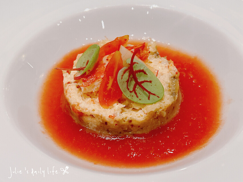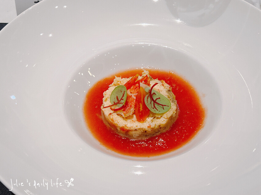 清爽的番茄果泥,搭配上鮮甜的帝王蟹肉,茄子泥若有似無的微妙存在感,讓整道料理呈現一種微酸中帶著鮮度的感覺。
