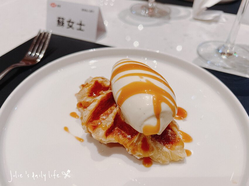 甜點是可頌鬆餅搭配上海鹽焦糖醬跟香草冰淇淋。