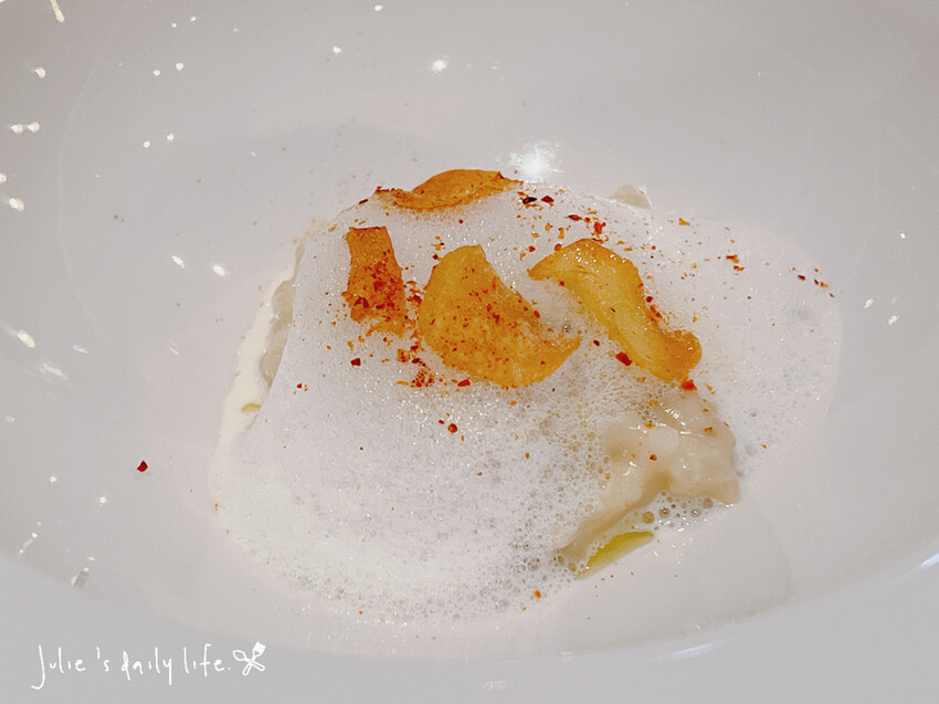 這一道有點分子料理的概念,煙燻泡泡一上桌就是一個亮點。