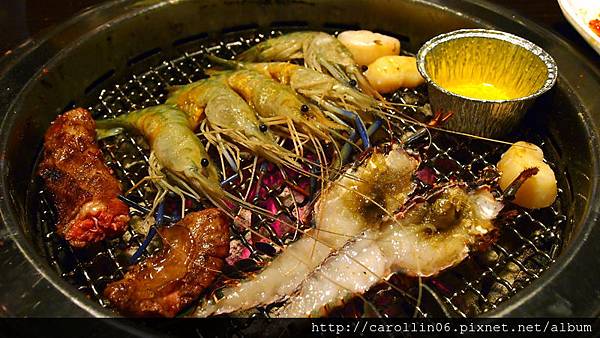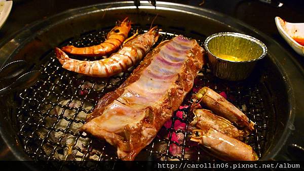 另外也還有泰國蝦,也是一道很難得出現在吃到飽燒肉店的食材,我從小就非常喜歡泰國蝦的味道,小時候釣蝦完都會整個放到鹽水裡再烤,可惜這份裹的不夠厚,味道有差。