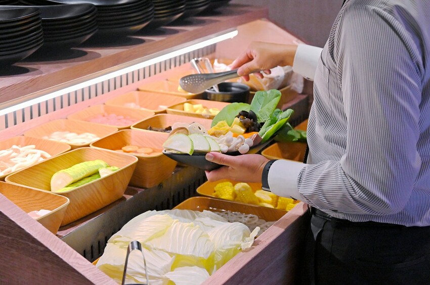 來到自助吧區,最主角的當然就是中間的40種蔬食自助吧台,除了火鍋料以外,也有新鮮豆腐青菜,甚至是花枝漿都有提供無限量吃到飽。品項算挺多的。飲料部分有氣泡飲料機、冰沙、咖啡跟果汁等等也蠻多樣的。