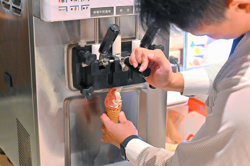 店內還有提供兩種霜淇淋口味,根據季節也會有口味變換,我們這天來供應的是草莓跟香草,可以擠單一口味也能綜合。