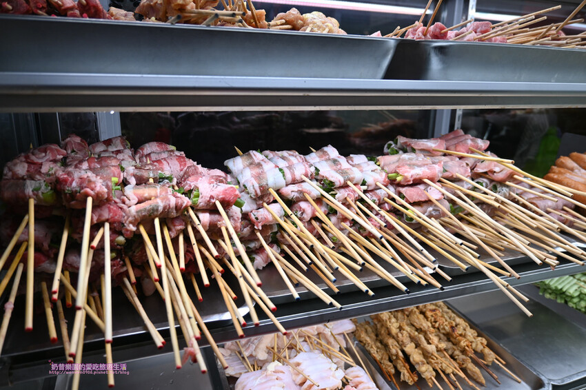 豬五花、豬肉串、雞肉串、百葉、豬血糕、去骨雞腿(由左至右)