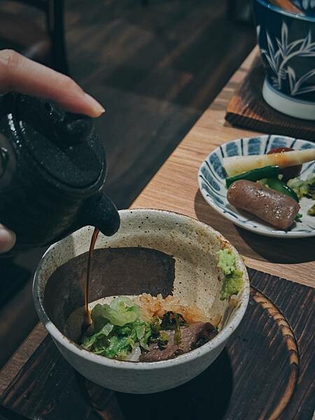 二吃加入醬料盤中的柚子胡椒,山葵,七味粉,醬油等,在加入店家自製的漬物.