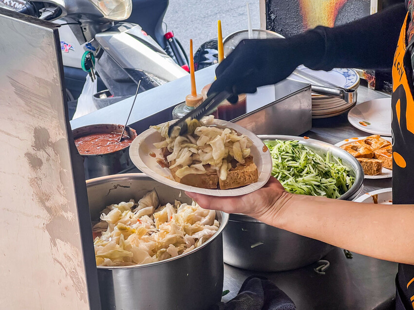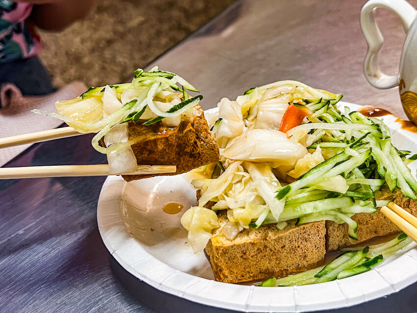 標準吃法是將小黃瓜和泡菜一起塞入其中一同品嚐,外皮具有一定的酥脆感,但卻不會讓人感到乾硬刮口,中心則是軟嫩多汁的狀態,至於其獨特的「臭度」,確實相當濃厚,但是不討厭的那種臭豆腐臭香,台式泡菜很有脆度水分,微酸帶甜跟臭豆腐很搭,愛吃辣的朋友可以加點辣,但請斟酌這的辣醬很辣唷