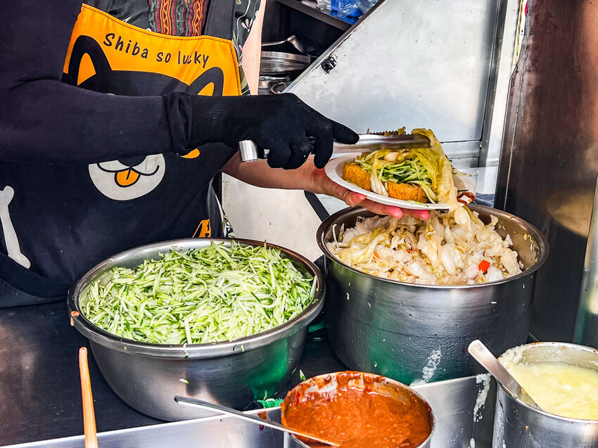再來加上泡菜跟小黃瓜絲,下手完全沒在跟你客氣,泡菜跟小黃瓜堆好堆滿,幾乎都看不到下面的臭豆腐,有夠大方的