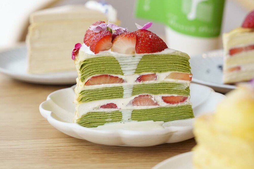 #台中千層蛋糕 #抹茶草莓 則是店內的人氣品項,選用了宇治小山園抹茶,配上丸久小山園抹茶鮮奶油和先生自製起司醬以及新鮮草莓