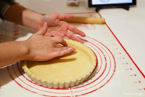 接著放入模具後塑型,把多餘的切開後貼滿模具