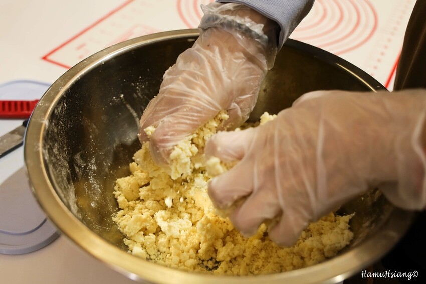 先使用麵粉.香草精.糖等等進行搓揉,同時間店員也有提醒我們可以先把烤箱做預熱~