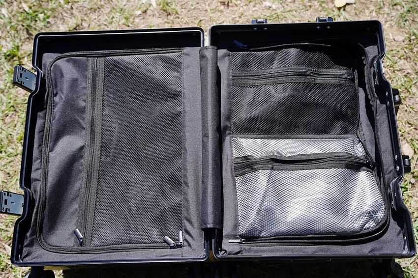 這個行李箱的收納空間真的很貼心。它使用了全包覆式拉鍊,並且有雙網狀的收納層設計,可以讓你的物品清楚地分類整理。最外層的空間很方便,可以放置一些常用又容易取得的物品。由於是雙網狀收納層,所以一眼就能看到裡面的東西,取得也相當容易。