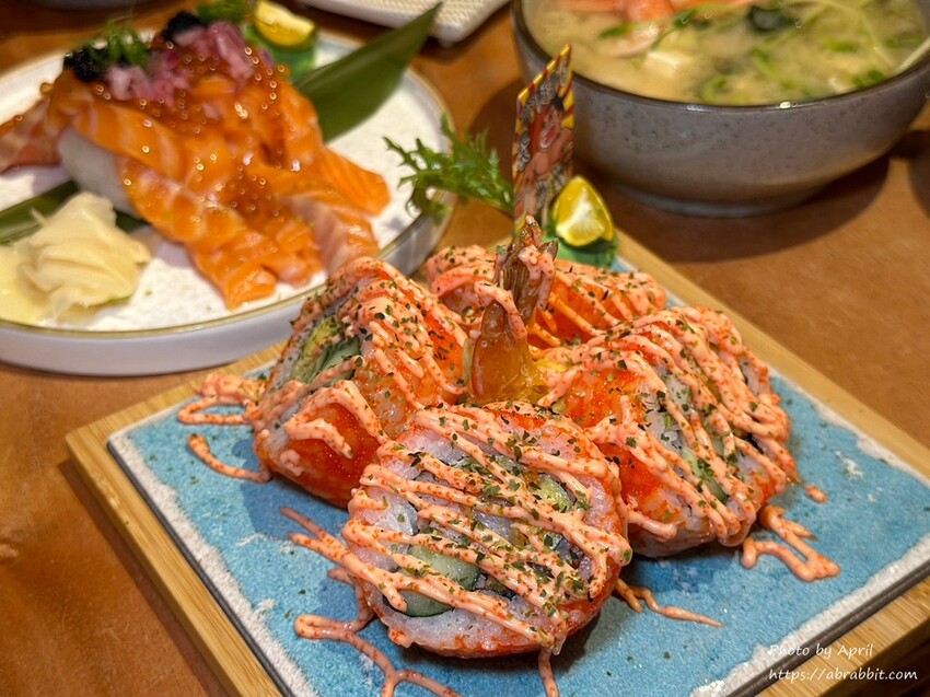 炸蝦捲壽司外觀也是非常吸睛,裡頭包著蝦肉,外層的壽司皮則是有蝦卵,最後再淋上蝦卵搭配的美乃滋醬,令人看了就食慾大開啊!